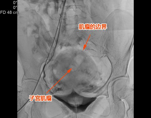 △術後造影可見肌瘤左右側的供血已被掐斷。